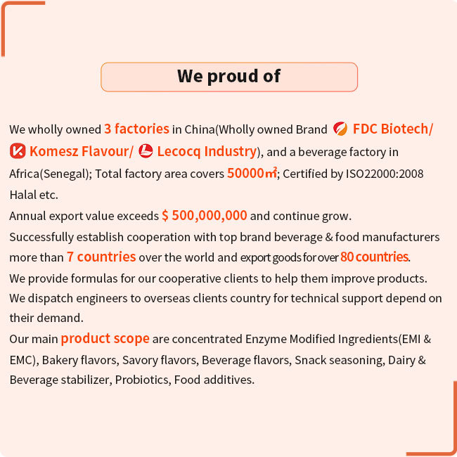 Offriamo più di 4000 tipi di aromi alimentari, stabilizzatori per latticini e succhi, probiotici, sciroppo concentrato e prodotti per il miglioramento nutrizionale.